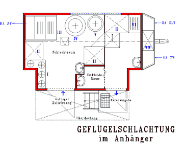 I Betäuben, Stechen, Entbluten IV Rupfmaschine II Tisch V Wachskessel/ Kühlbecken III Rotationsbrühmaschine VI Abspülrost/ Brause